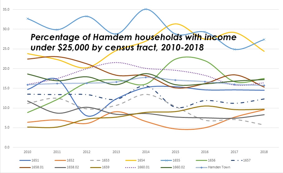 Analysis of Census data for the years 2010 – 2018 for each of Hamden’s 12 Census tracts reveals that residents of some parts of town experience life differently than residents of other parts. In short, it appears there are geographic areas within Hamden that have been systemically relegated to perpetual poverty.