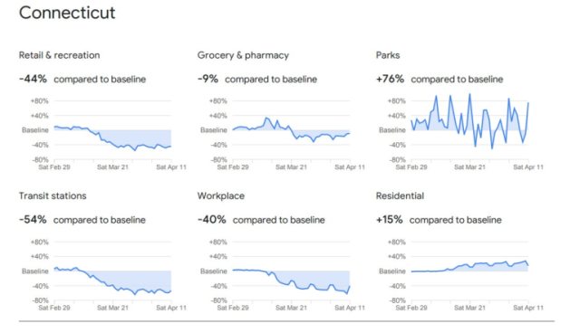 The latest Google mobility charts, dated April 11, show Connecticut residents visited retail and recreation facilities 44 percent less than during the pre-crisis period, and workplaces 40 percent less.