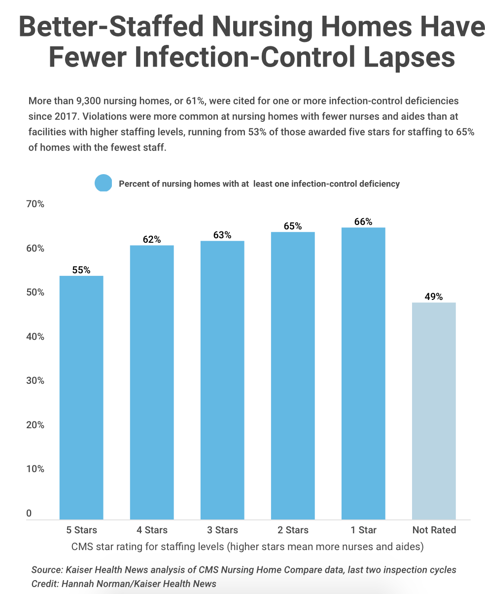 In the nursing homes hit hard by COVID-19, 22% had below average staffing capacity, compared to 7% in the nursing homes without the disease. Nationwide, an analysis done by Kaiser Health News found that better-staffed nursing homes had fewer infection-control problems.
