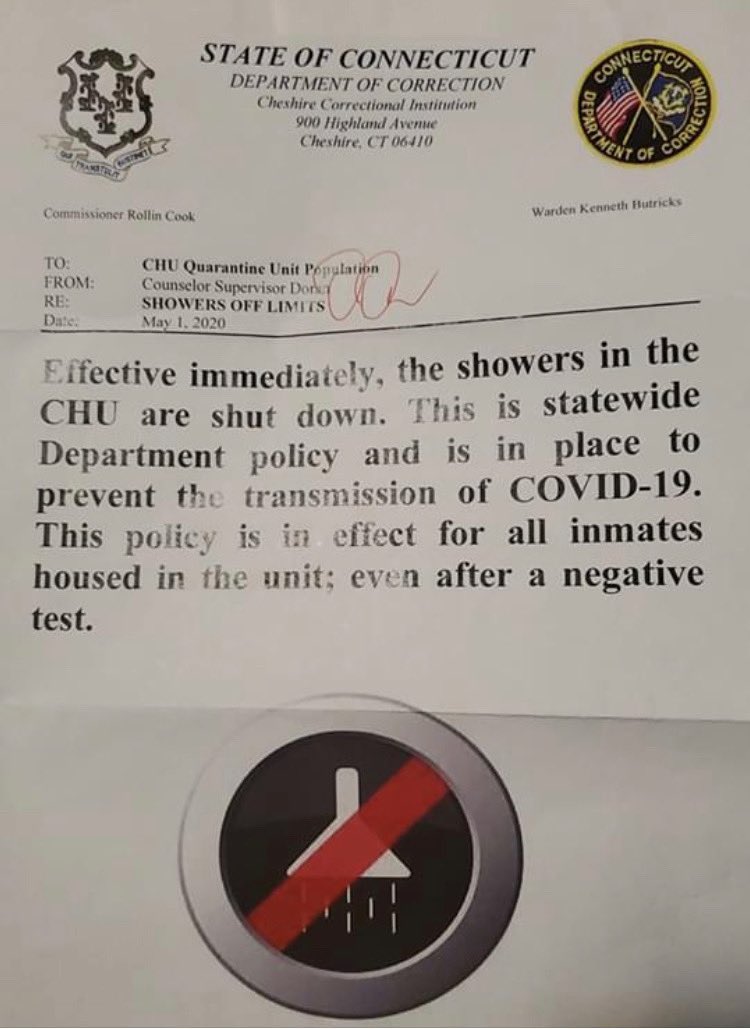 A memo issued on May 1 from a Department of Correction official states that showers in a Cheshire Correctional Institution housing unit are shut down until further notice. The note says, “This is a statewide department policy and is in place to prevent the transmission of COVID-19,” and it applies to all who are housed in that unit, even after they have tested negative for the virus.