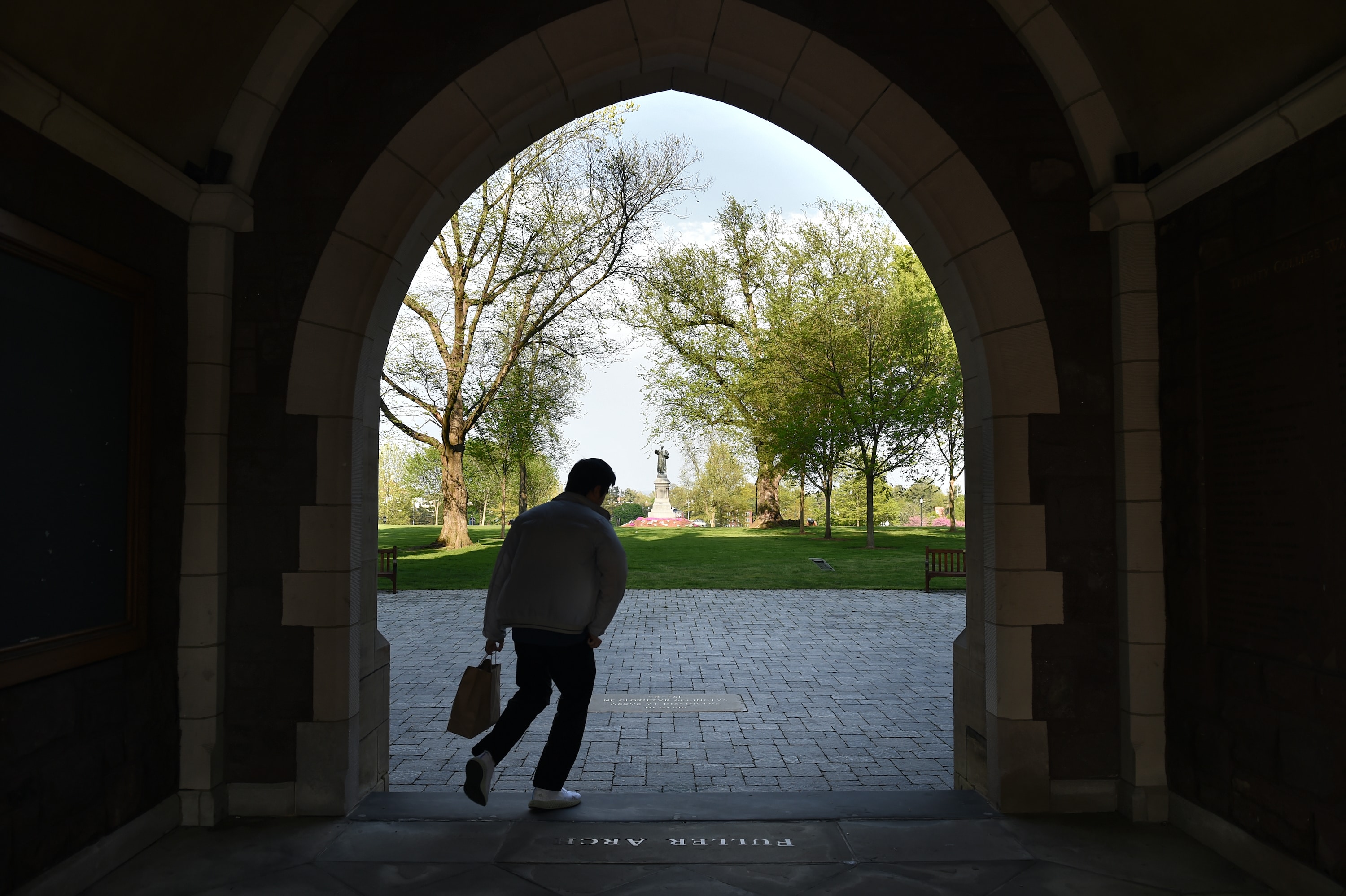 Trinity-College-campus-scene A student walks through the Fuller Arch to the main quad at Trinity College in Hartford.