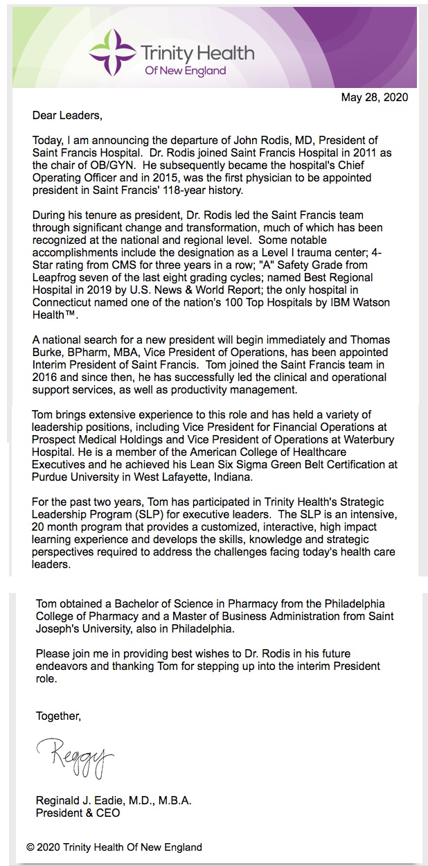 Rodis departure letter Rodis’ immediate departure was announced to employees Thursday in a hospital-wide email from