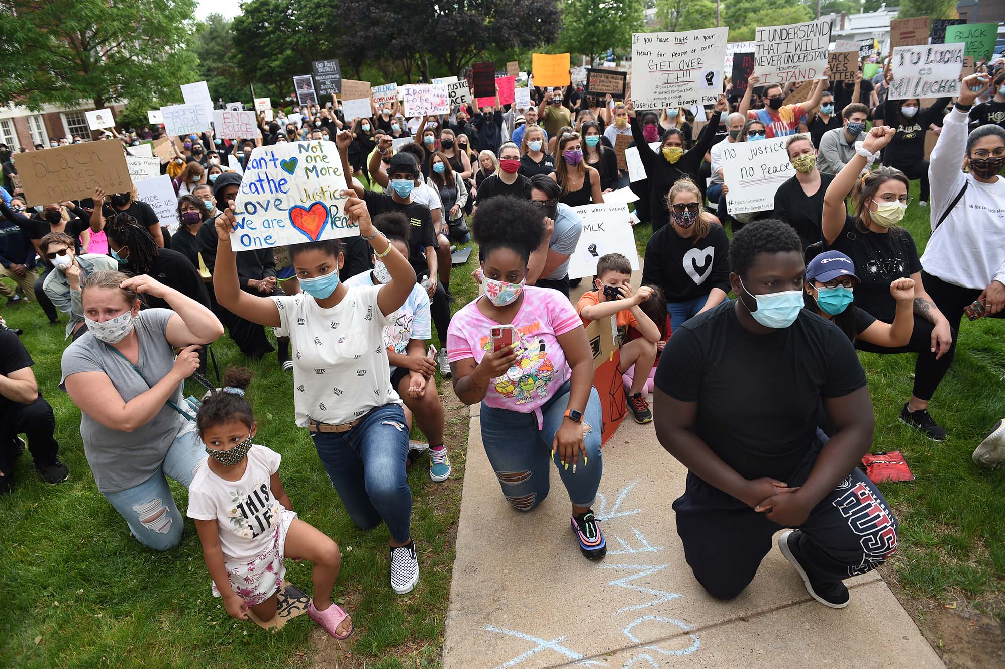 A crowd of about 1,500 people took to their knees for eight minutes to commemorate the time it took for a Minneapolis police officer to kill George Floyd on Memorial Day during a Black Lives Matter rally at West Hartford Town Hall. Credit: Cloe Poisson / CTMirror.org