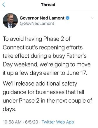 The governor already has reconsidered a ban on graduation ceremonies. On Wednesday, Lamont said that that graduations could begin July 6, following certain guidelines: They must be held outdoors, limit attendance to 150 graduates and guests, and maintain social distancing protocols.