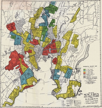 In order to keep consumption safe and permanent, administrators counted on explicit language in The Home Owners’ Loan Corporation (HOLC) ordinances, baked into FDR’s popular New Deal. Intended to relieve the worst effects of the Great Depression with government-backed mortgages, HOLC rated areas according to mortgage risk. Areas tagged as highest risk (red) were ineligible for government-backing. They contained the poor and minorities, carved out of the New Deal. New Haven Urban Renewal displaced 60,000 poor and black people, herding them into the red areas of concentrated poverty and into inhuman public housing projects — storage units, really.
