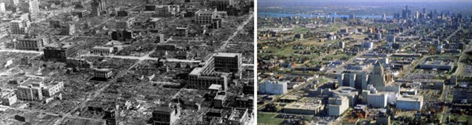 Osaka, Japan, following WWII bombing and Detroit following urban renewal.