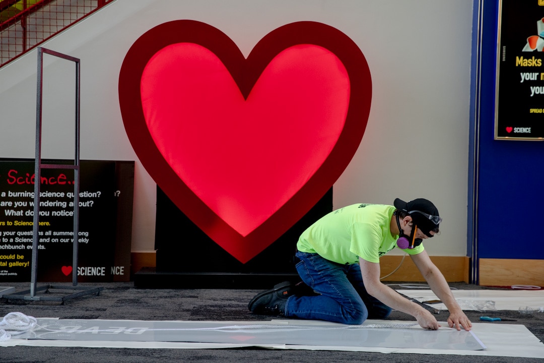 Liam Cawley, exhibit manager, wears a mask while installing signs on June 18 at the Connecticut Science Center. Online timed ticket reservations are required for all visitors, and visitors over two years old should wear masks. Credit: Yehyun Kim / CT Mirror