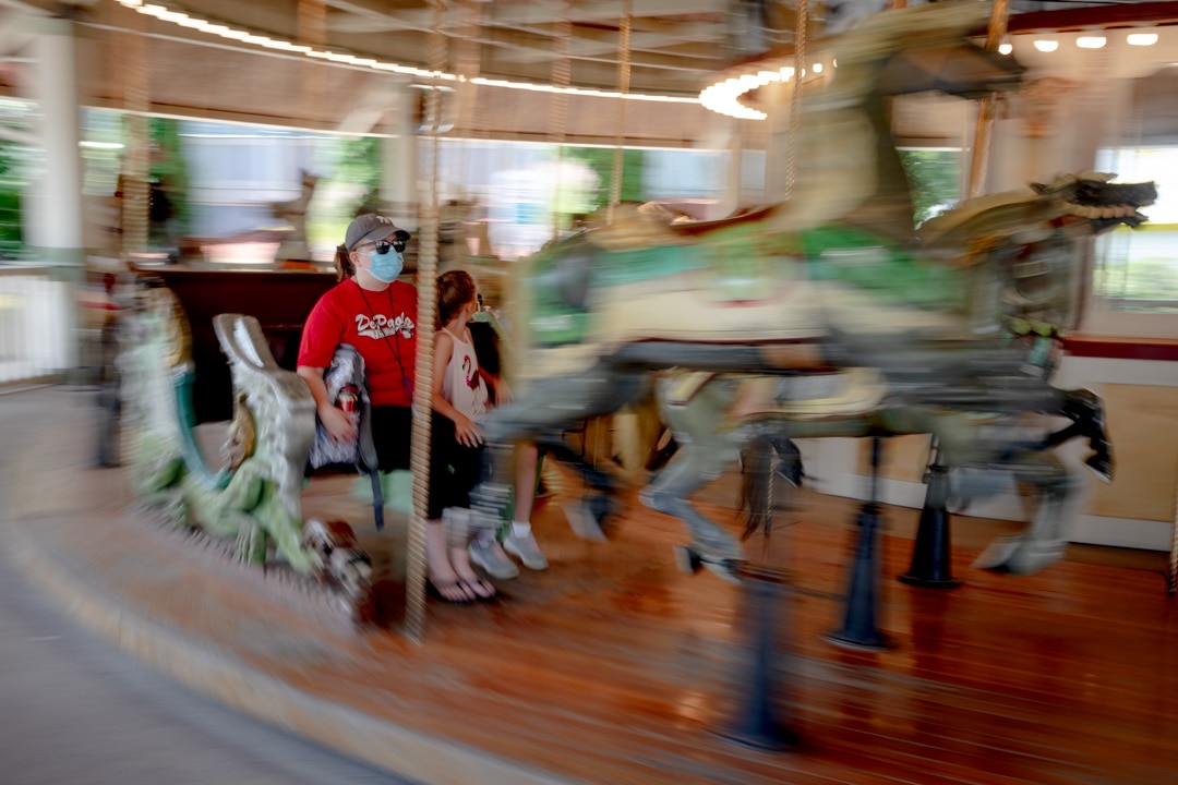 Beth Corbin, left, from Middletown, rides a carousel with her daughter, Madeline, 7, on Wednesday at Lake Compounce. "We try to do as much outside of the house as we can," Beth said. "With all the precautions, they are making us feel very comfortable coming. And the fact that it's mostly outdoor." Credit: Yehyun Kim / CT Mirror