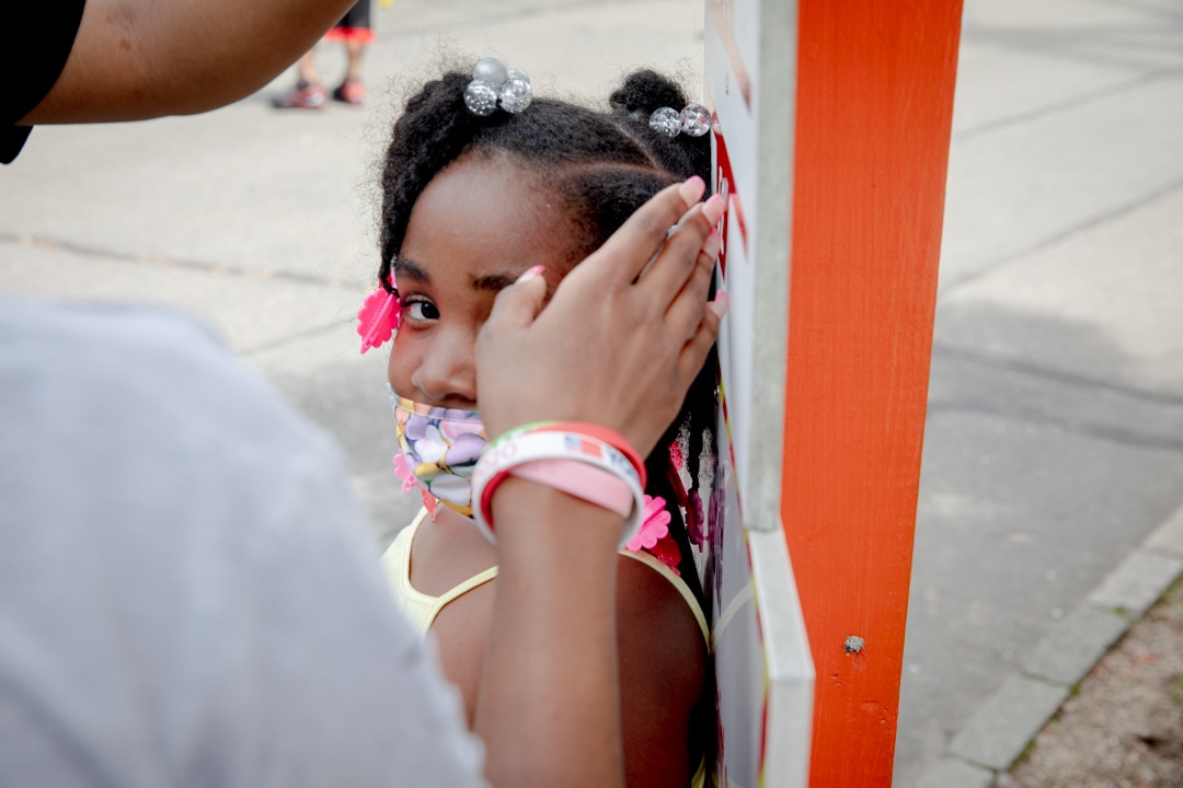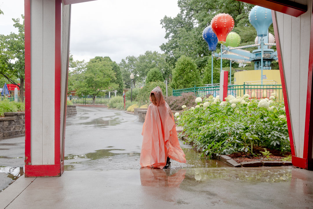 Mikayla Baez, 5, from Meriden, plays in a puddle on Wednesday at Lake Compounce. Mikayla was so bored at home during this pandemic that she began to blog her daily adventures with her her mom, Brenda. Credit: Yehyun Kim / CT Mirror