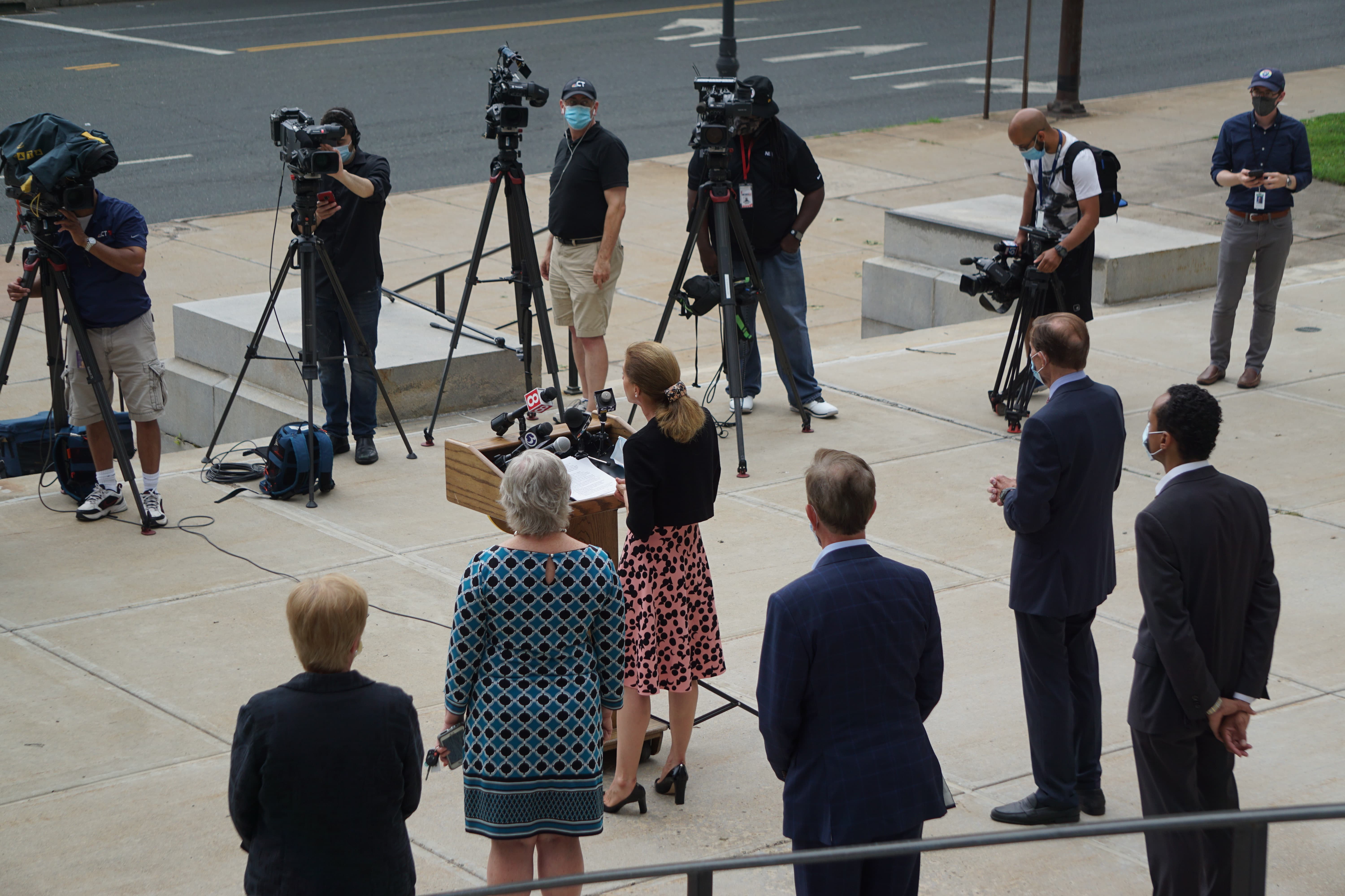 When rain began to fall, the press conference continued with Lamont holding an umbrella over subsequent speakers.