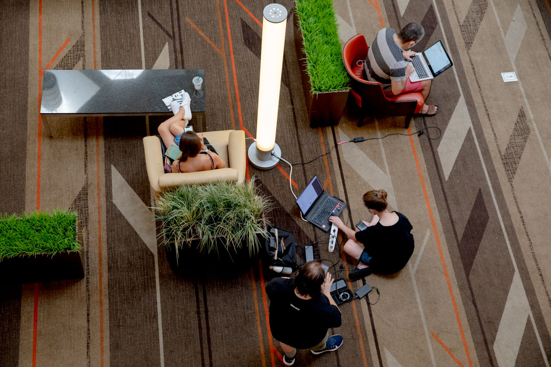 Visitors sit in the hall while charging their devices at Westfarms. Credit: Yehyun Kim / ctmirror.org