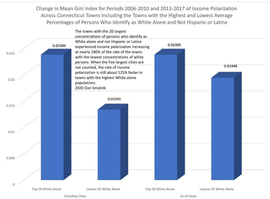 This turns out to be important because whiter towns in Connecticut have also demonstrated another, more insidious economic phenomenon. During the periods tested, years 2006-2010 and 2013-2017, the level of income inequality in 119 of Connecticut’s 169 towns rose. In 50 of our towns, inequality actually decreased. The towns with the highest proportions of residents identifying as white also exhibited the largest increases in income inequality. Conversely, those towns with the lowest percentage white populations produced the lowest increases in inequality.