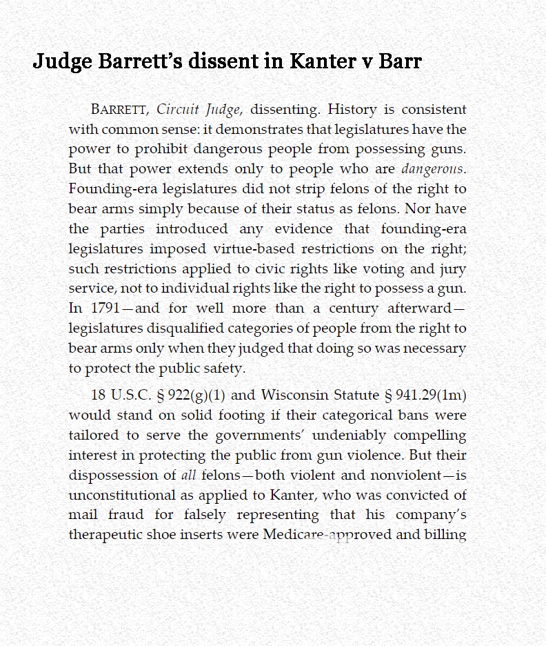 In her dissent in the Kanter case, Barrett also said the state of Wisconsin failed to demonstrate the felon ban resulted in less gun violence.