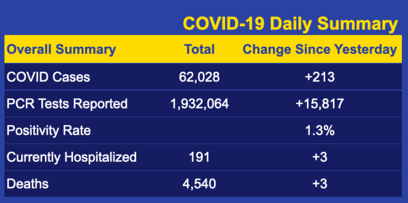 The daily positivity rate of COVID tests statewide was 1.3%, a welcome drop after the first back-to-back days of 2% or more since June. The rolling seven-day average remained at 1.6%, and there were only three new hospitalizations.