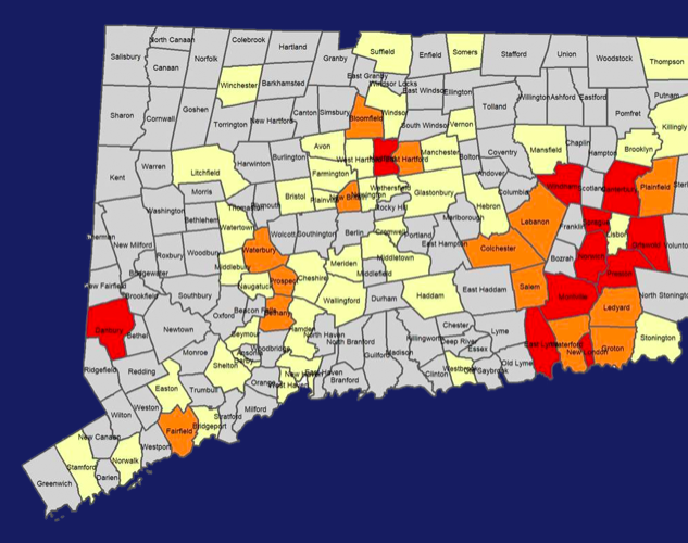 Nine of the 11 alert communities are in southeastern Connecticut. The two outliers are Hartford and Danbury, the latter still trying to quell one of the first outbreaks after the state successfully flattened the curve of COVID cases.