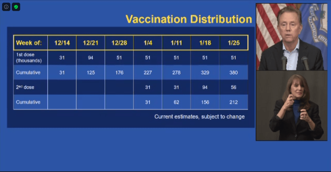 Lamont warned Thursday that there may be delays in shipments of the vaccines, particularly those from Pfizer, but expressed optimism about the timeline.