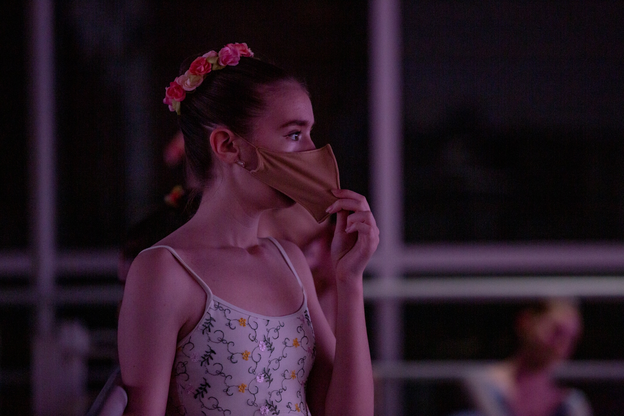 A dancer moves her mask so she can take a deep breath after a strenuous act. Credit: Yehyun Kim / ctmirror.org