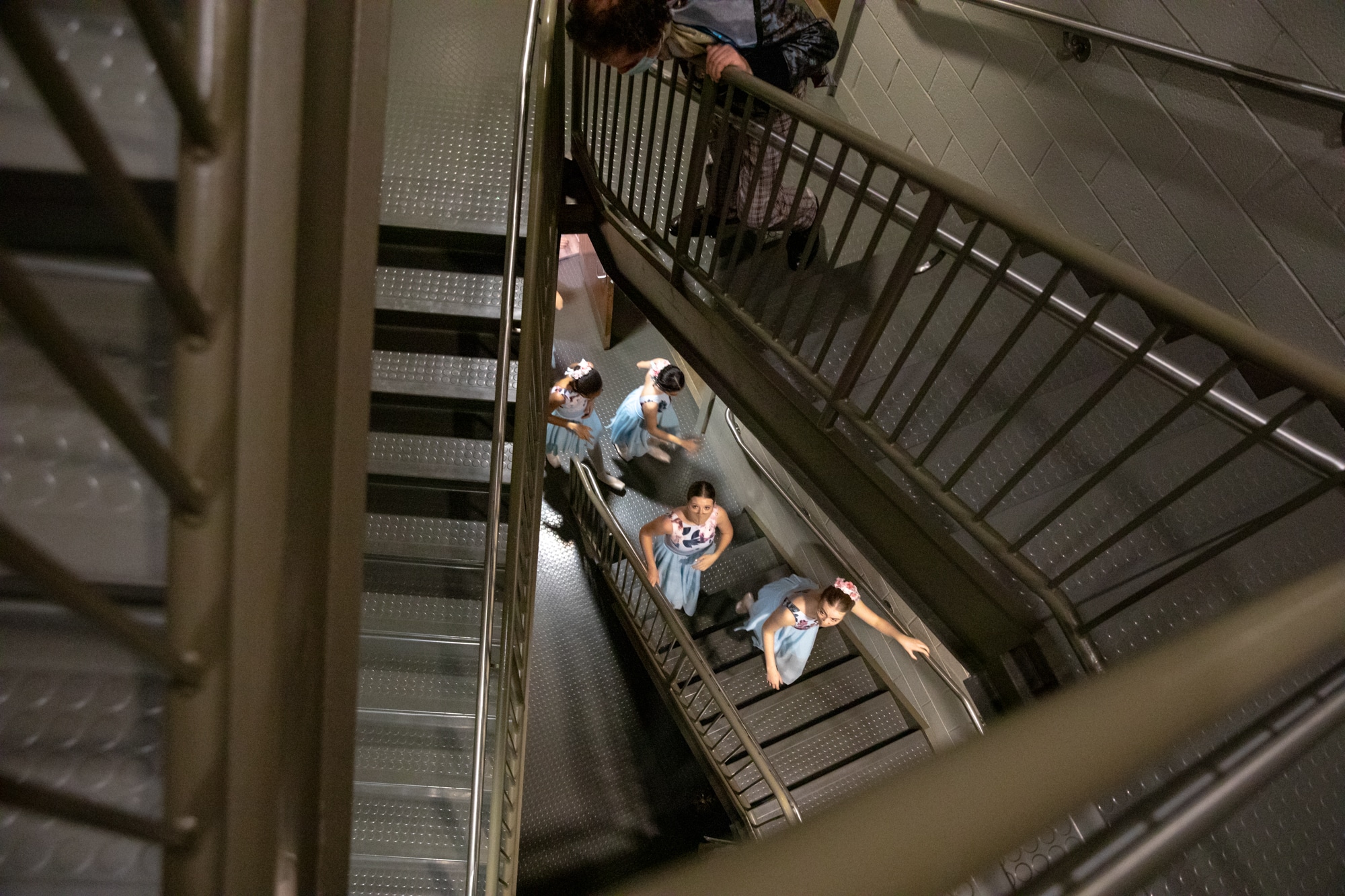Dancers walk up the stairs to perform the Nutcracker. Instead of having all 70 dancers on the stage at the same time, several groups waited on different floors and came up at their time to go on stage. Credit: Yehyun Kim / ctmirror.org