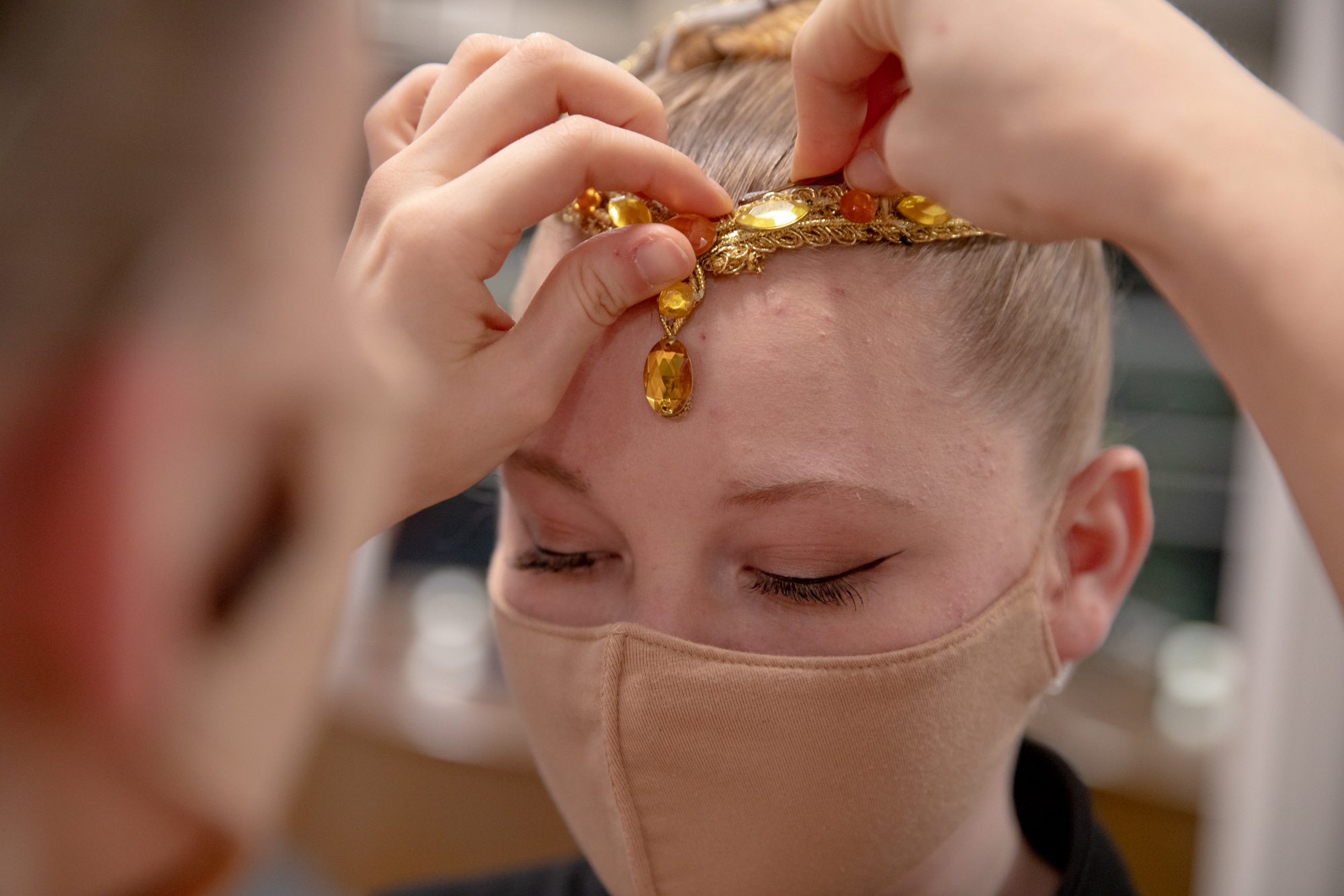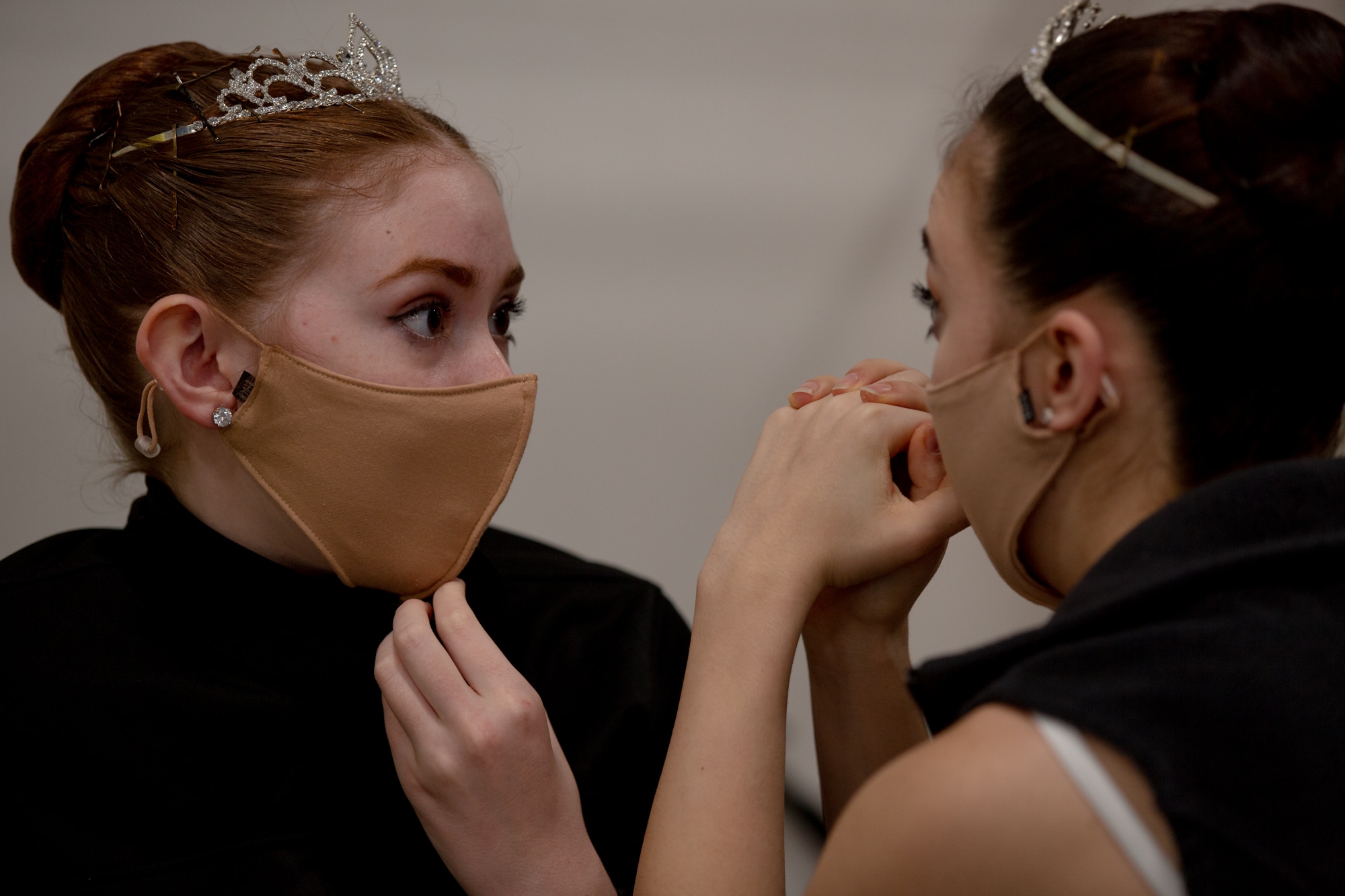 A dancer adjusts a friend’s hair before the Nutcracker live-streaming performance. Thirty-two dancers in the show were resident students. “Especially living in quarantine almost, they were like a family unit,” said Victoria Mazzarelli, artistic director. Credit: Yehyun Kim / ctmirror.org