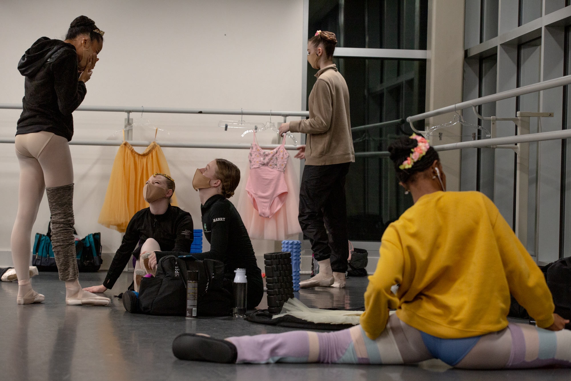 Dancers warming up before the show. The Nutmeg Ballet Conservatory switched from in-person classes to online in March. Since August, when students from across the country returned to live and practice together, friend and family visitations have been limited to prevent COVID-19 cases. Credit: Yehyun Kim / ctmirror.org