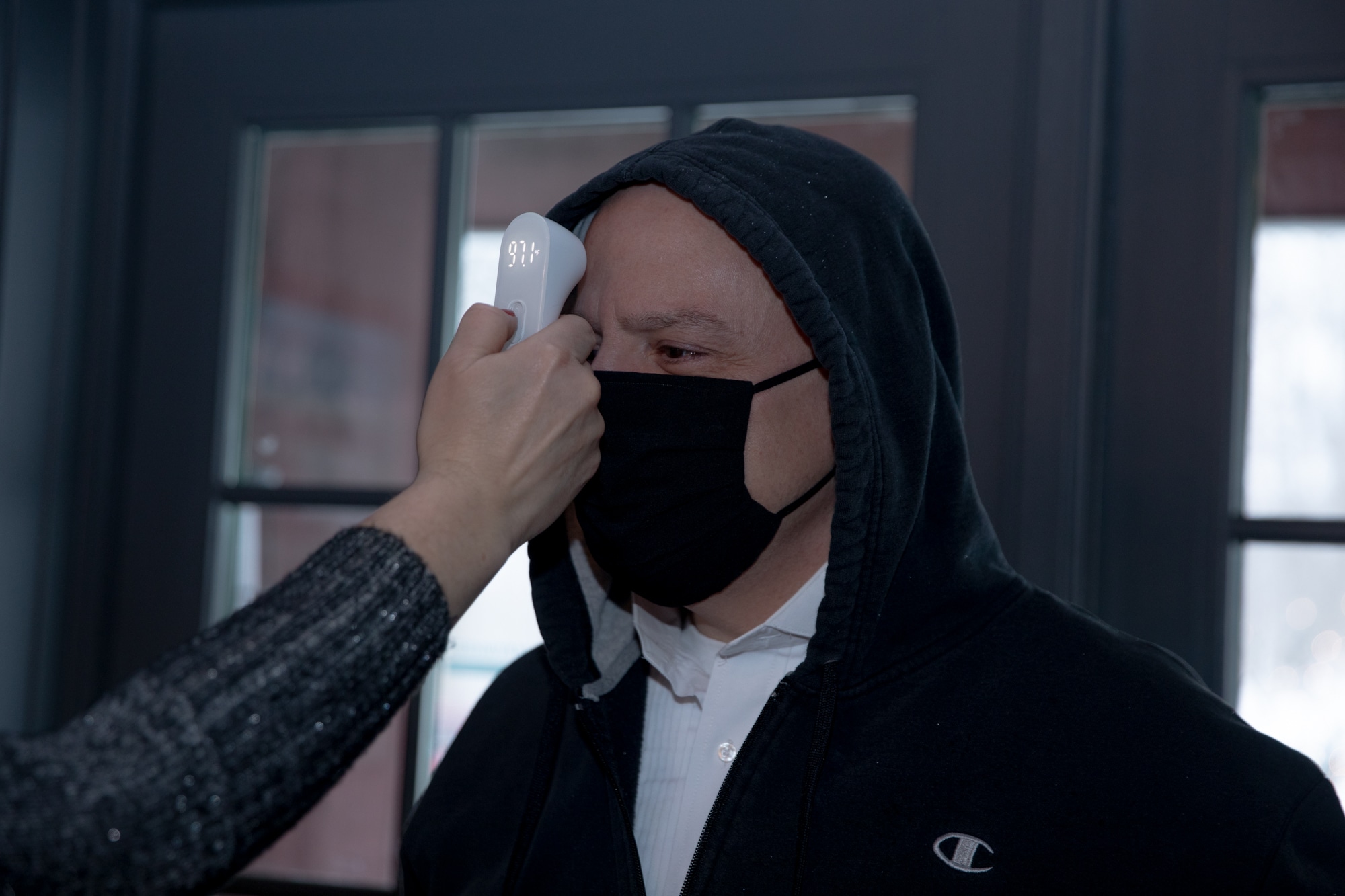 Patrick R. Spadaccino has his temperature checked at the entrance of the Ridgefield Theater Barn. Credit: Yehyun Kim / ctmirror.org