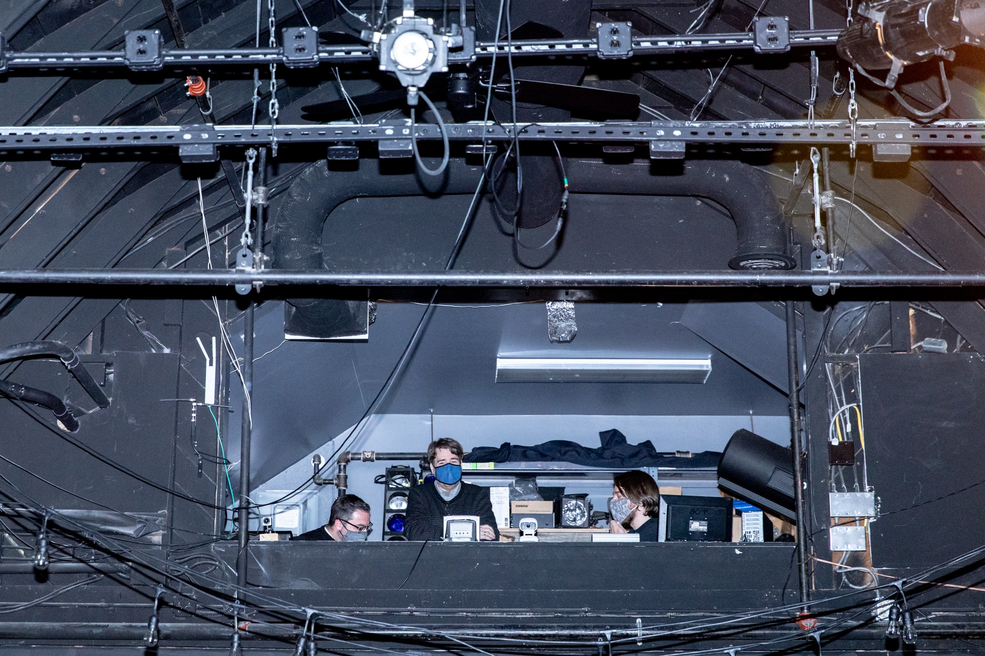 Scott R. Brill, director, center, and light and sound staff talk before the performance. In order to reduce the risk of COVID-19 infection, the Ridgefield Theater Barn team has cut the number of staff needed to run the show to five people, including the actor. Credit: Yehyun Kim / ctmirror.org