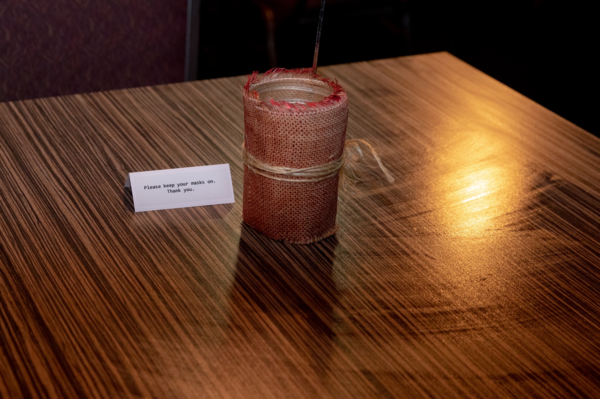 A sign asking patrons to keep their masks on a table that’s just been disinfected. “We had some very full houses, we had some very small houses,” said Jones. “We just knew it was going to be like that. But we felt it was important to try to stay relevant.” Credit: Yehyun Kim / ctmirror.org