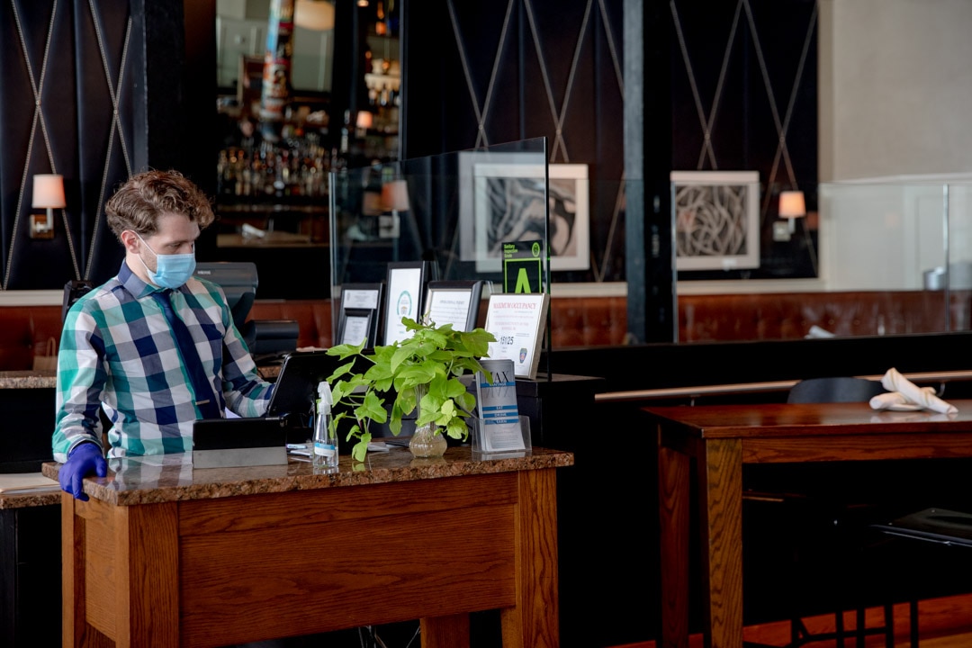 Steven Lewis, restaurant manager, checks reservations wearing a mask and gloves on Thursday, Oct. 8 at Trumbull Kitchen in Hartford. Credit: Yehyun Kim / ctmirror.org