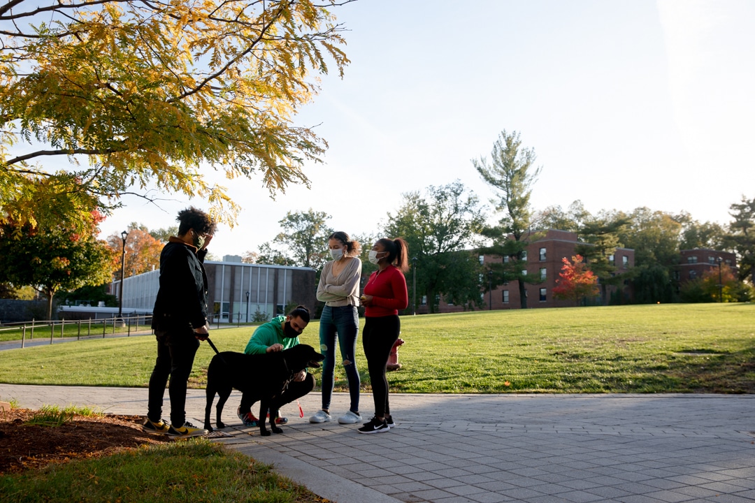 From left, Chris Cooper, Xavier Mercado, Alicia Anchondo, and Jasmine Burns talk wearing masks on Thursday, Oct. 15, 2020. Mercado, Anchondo and Burns, from Chicago, are freshmen. They said they socialize by walking outside and talking on a video call. Credit: Yehyun Kim / ctmirror.org