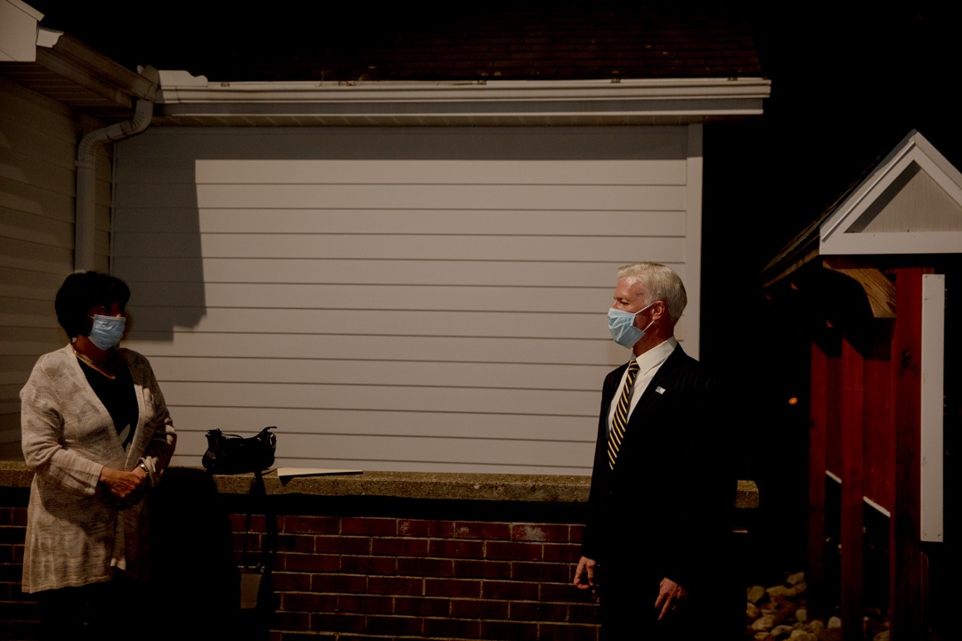 David X. Sullivan, right, talks to a staff before the forum on Thursday, Oct. 22 at Wolcott Town Hall. Sullivan, a former federal prosecutor, is challenging incumbent Democratic Congresswoman Jahana Hayes for the fifth congressional district this year. Credit: Yehyun Kim / ctmirror.org