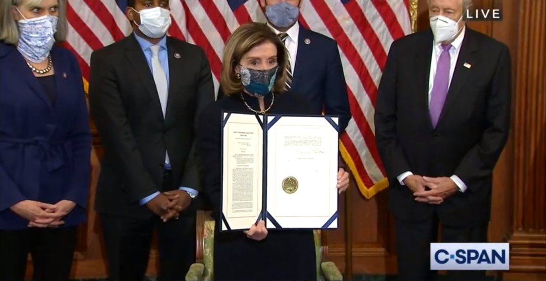 Speaker of the House Nancy Pelosi signs the article of impeachment on Wednesday, Jan. 13, 2021.