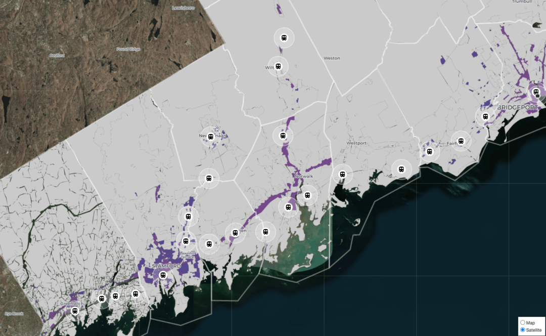 A screen grab of the so-called “Gold Coast” in Southwest Connecticut. This map shows in purple how much of the land that is within a half mile radius allows multi-family housing without needing special permission from local officials. Click on the image to explore the interactive map.