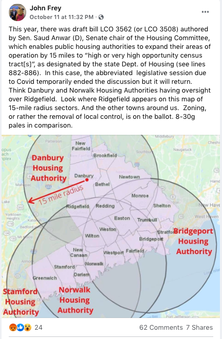 “Think Danbury and Norwalk Housing Authorities having oversight over Ridgefield,” former longtime state Rep. John Frey, R-Ridgefield, wrote on Facebook in October of the potential of two nearby majority-Black and Hispanic towns getting involved in his overwhelmingly white community.