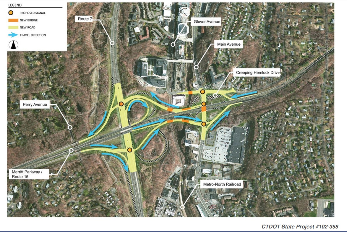 Returning back to the project’s goal: to “provide the missing connections.” This statement is not entirely accurate. Because anyone who can read a map will see that these connections already exist. Are you a westbound driver on Route 15 wanting to go north up Route 7? Take the Main Avenue exit and make a right. Route 15 westbound wanting to go south on Route 7? Exit onto Main Avenue, and just over a mile away, there’s an on-ramp from Route 123. The links are already there. What’s “missing” is the high-speed, free-flowing (alleged) connections. It’s not like there’s absolutely no way to get where you want to go in the current configuration. It just takes a few minutes more.