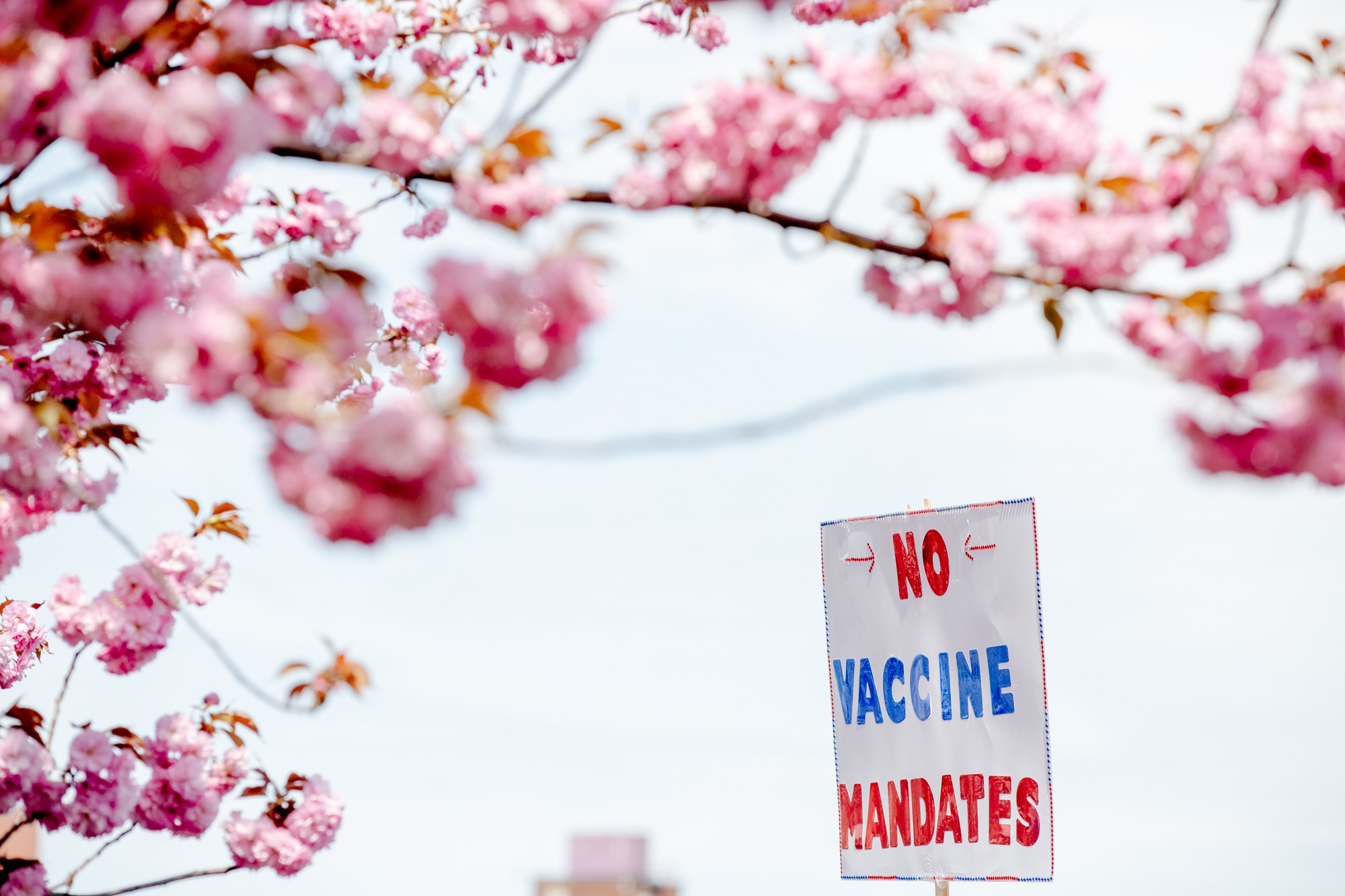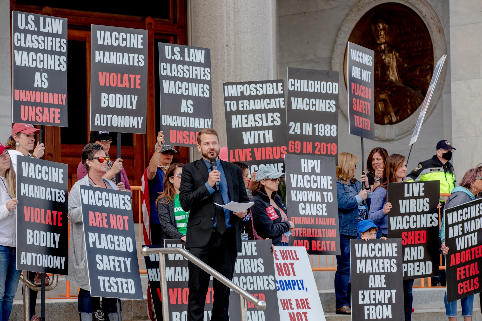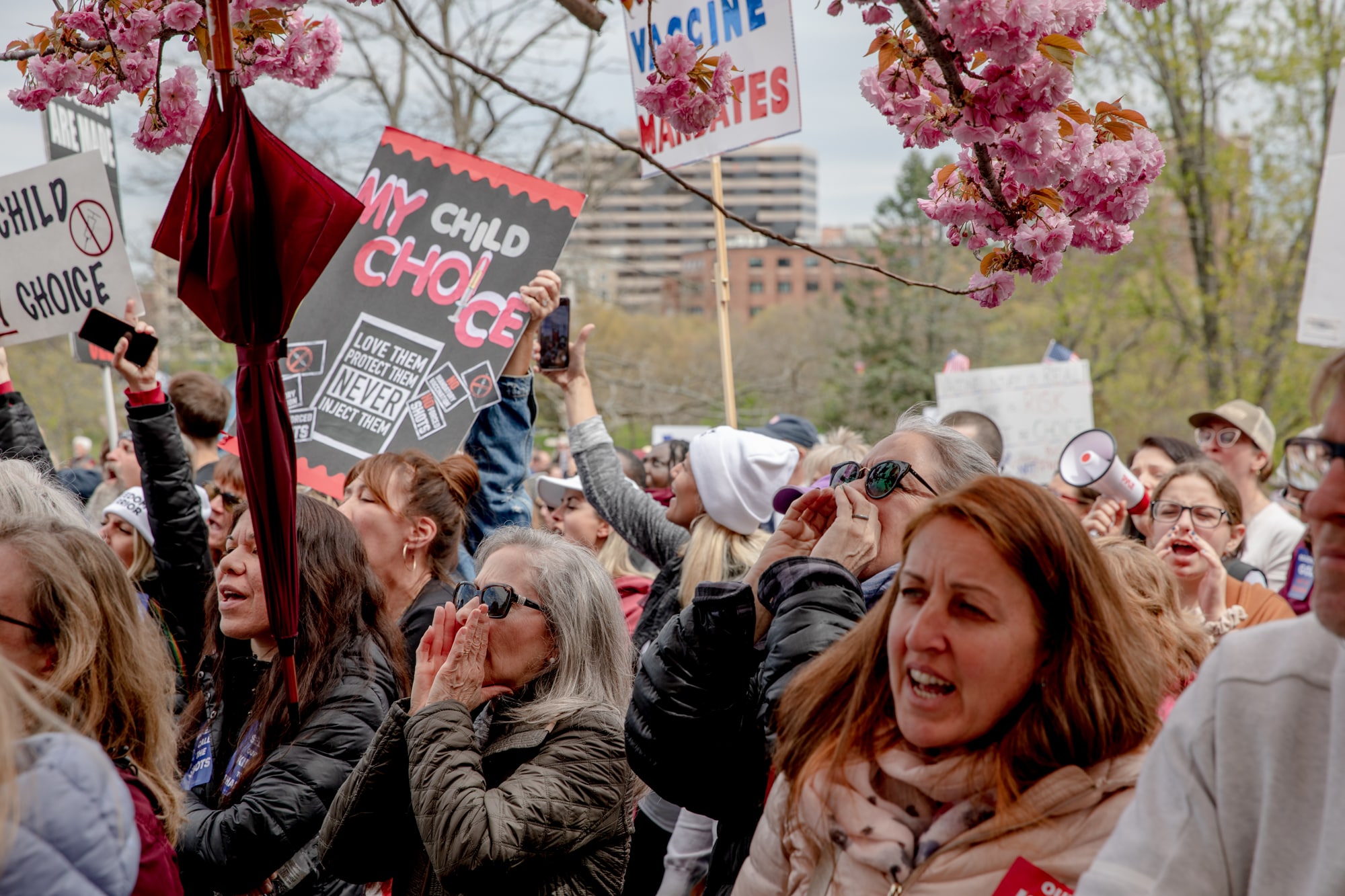 Mary Holland, president of Children’s Health Defense, a group opposed to required vaccinations that was founded by Robert Kennedy Jr., who still serves as its chairman, addressed activists on the west side of the building. She said parents are in the best position to decide what’s in their children’s best interest.