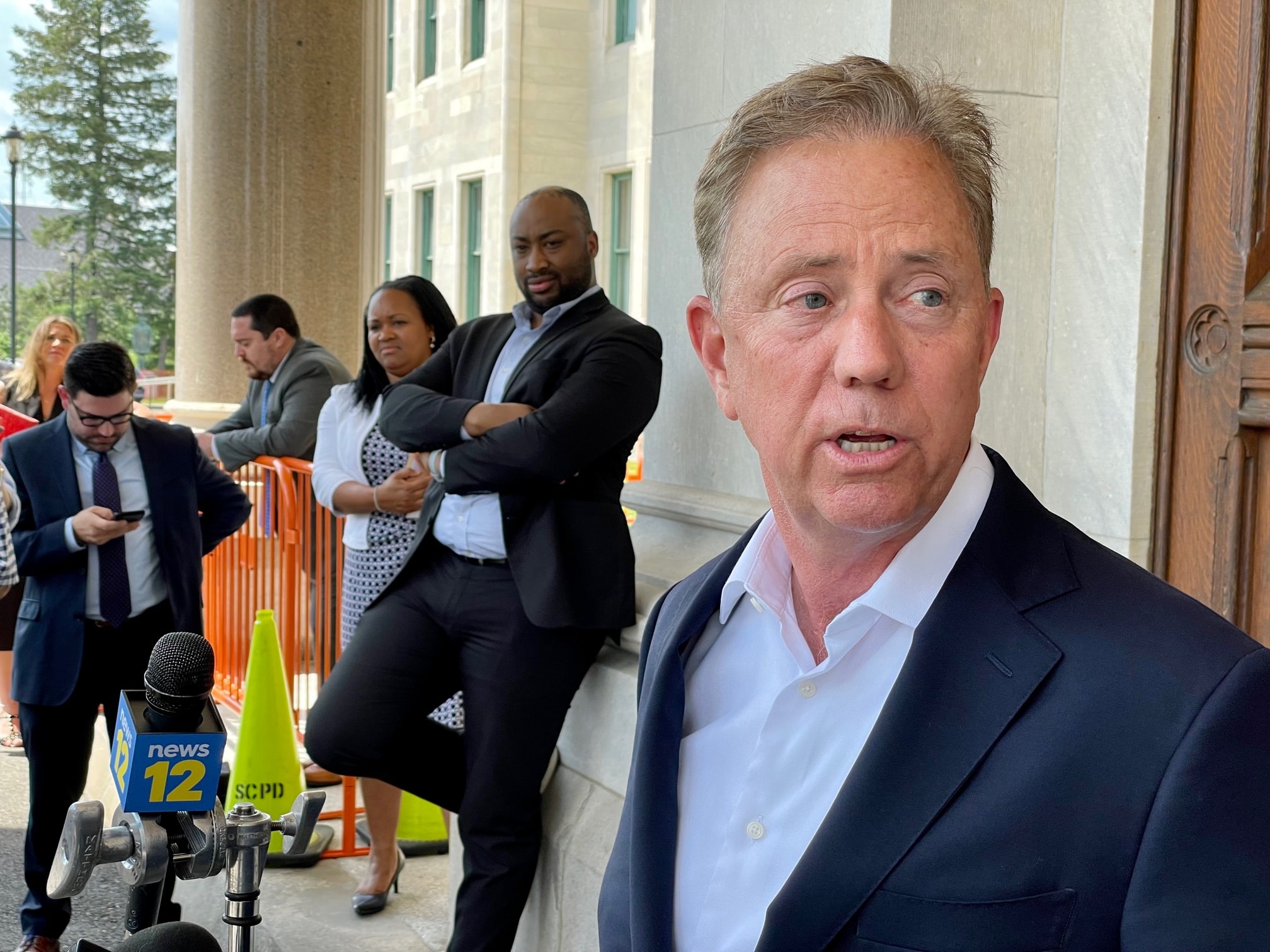 Gov. Ned Lamont “took exception” to Fonfara’s remarks as his senior staff watches. From left, Max Reiss, Melissa McCaw and Paul Mounds. Credit: MARK PAZNIOKAS / CTMIRROR.ORG