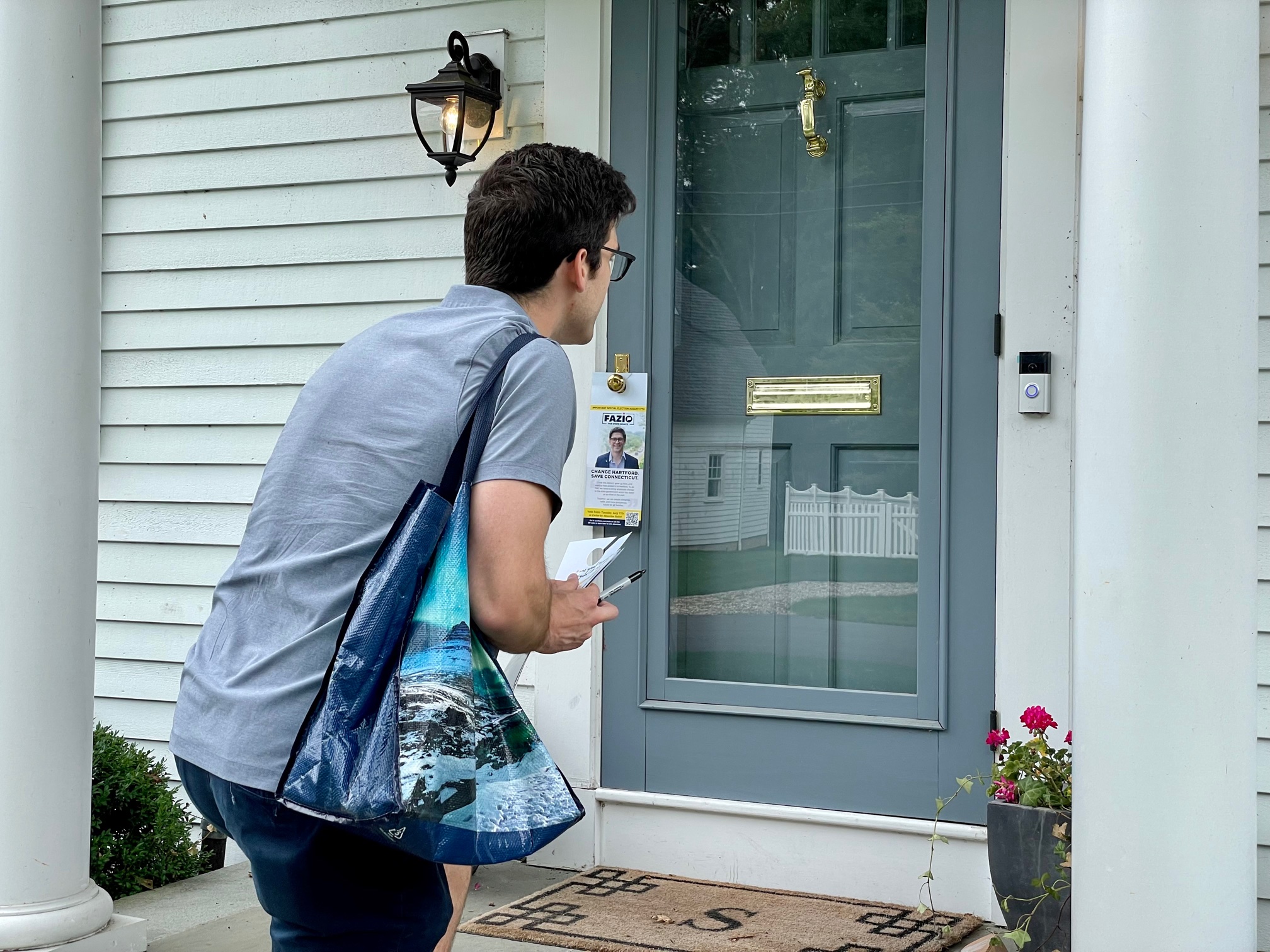 The struggles of a late-summer campaign were evident on recent rounds of door-knocking. In New Canaan, Fazio found himself trying to persuade an absent voter through a video and audio security system activated by him ringing the doorbell. Gevanter had slightly better luck trying to engage a Democrat leaving his house in Old Greenwich, dressed for the beach.