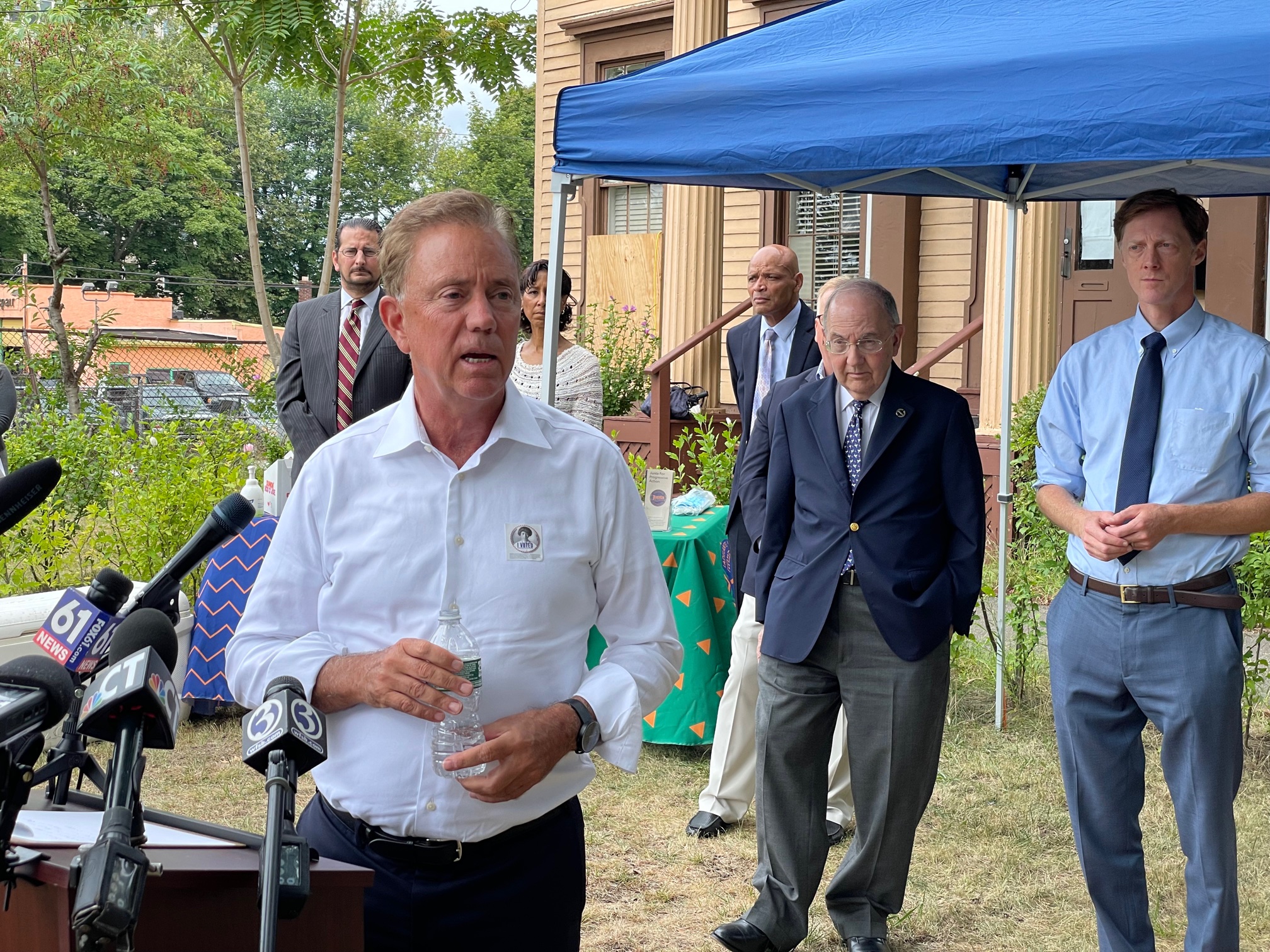 The governor spoke to reporters after an event publicizing the expansion of the earned income tax credit, which could benefit 220,000 adults and children. He then left for an event in New Britain to promote vaccinations for high school athletes.