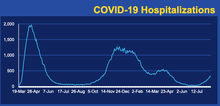 The state is experiencing its fourth surge in hospitalizations since the virus arrived in March 2020, each less intense than the previous one. The first reached 2,000, prompting the state to prepare temporary wards. The second came in the fall of 2020, topping 1,100. Hospitalizations fell below 500 in March 2021, rebounded again, then flattened in June.