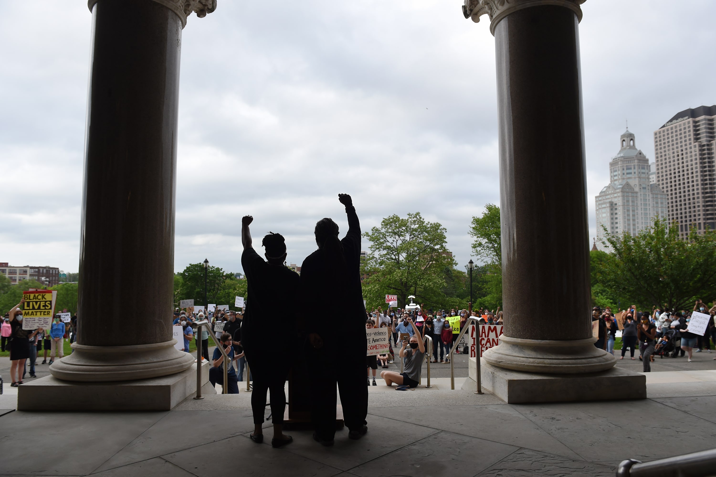 Bishop John Selders and his wife Pamela Selders, co-founders of Moral Monday CT, chant “Black Lives Matter” to a large gathering of protestors at the state Capitol Friday afternoon in response to the killing of George Floyd in Minneapolis at the hands of police on Memorial Day. Several hundred people attended the event to stand together against police brutality, abuse of power and racial discrimination. Credit: Cloe Poisson / CTMirror.org