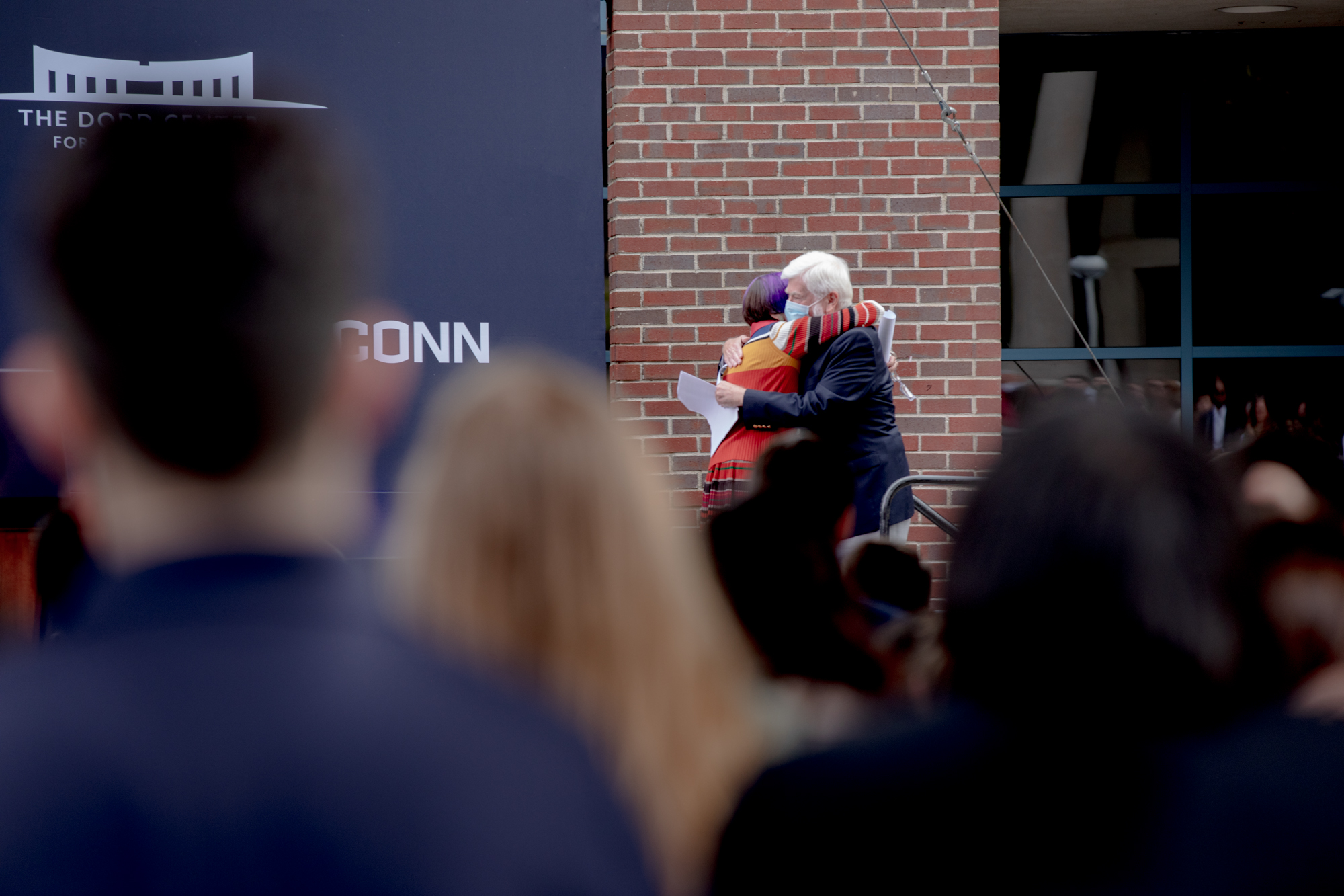 The re-dedication was held on a plaza outside the brick semi-circular façade of The Dodd Center. The renaming was approved by trustees in August, and the celebration was delayed after Biden made clear his wishes to attend.