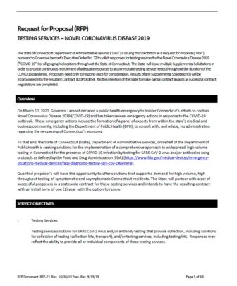 Then the lab-testing startup found a role for itself amid the crisis. On May 1, 2020, the state Department of Administrative Services, led by the state’s Chief Operating Officer Josh Geballe, put out one of several Requests for Proposals asking laboratories and hospitals to submit plans for large-scale COVID testing. (Geballe is a former IBM executive and tech entrepreneur; Annie Lamont’s investment fund, Oak HC/FT, was a major funder of Geballe’s tech startup.) State Comptroller Kevin Lembo said Geballe called the Comptroller’s office on May 3 to ask for help. Geballe asked Lembo to take on the responsibility of contracting and coordinating COVID testing, Lembo recalled.