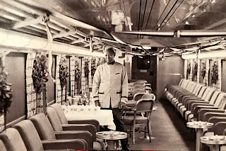 The plush custom-built car carried about 60 passengers, half the load of a regular coach. The car had its own buffet from which an attendant, Willie Spaulding (who worked there for 26 years), dispensed continental breakfast in the morning and poured adult beverages in the evening.