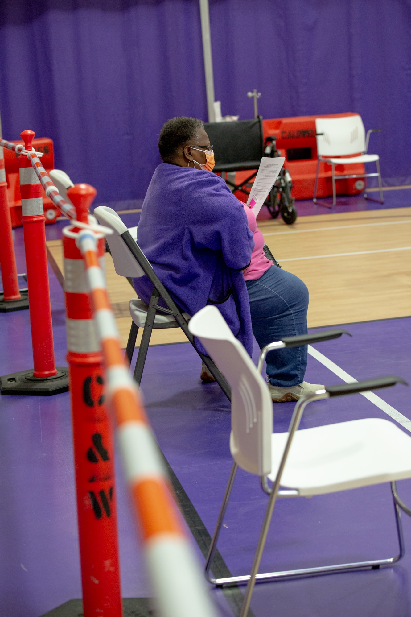 Theresa Wooten, of Bridgeport, reads while waiting in the observation section after getting the first dose of COVID-19 vaccine at the University of Bridgeport. Credit: Yehyun Kim / ctmirror.org