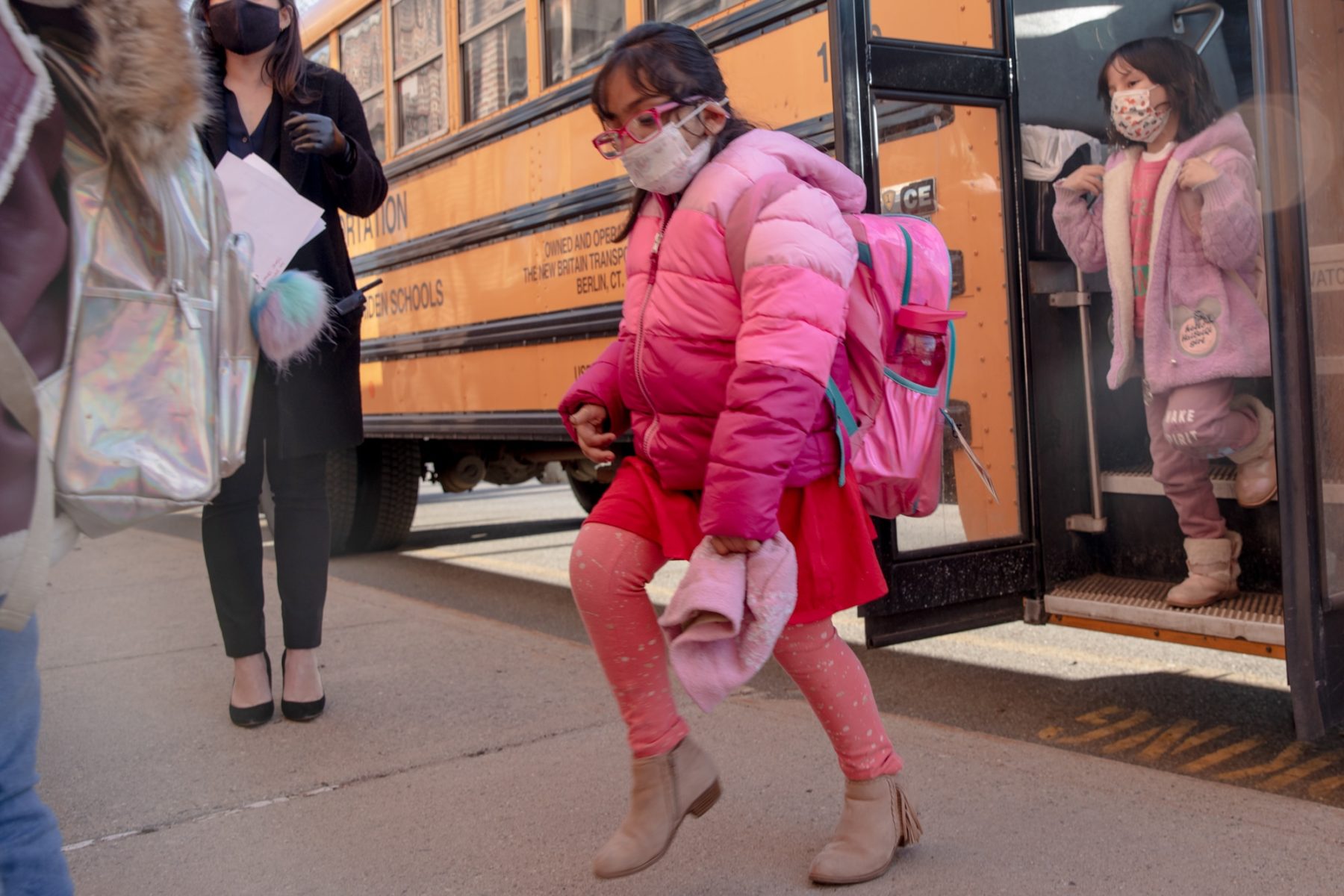 Ayaat Siful, 5, walks to Roger Sherman Elementary School in Meriden. Students can choose to attend in-person class five days a week or join distance learning. Credit: Yehyun Kim / ctmirror.org