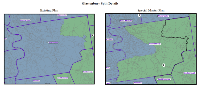 The final plans of the Republicans and Democrats were not dissimilar, with the differences focused mainly on the fate of Torrington, split between the 1st and 5th, and Glastonbury, split between the 1st and 2nd. But the Republican version would have moved about 125,000 from one district to another, while the versions offered by the special master affected 87,000, similar to the Democratic plan.