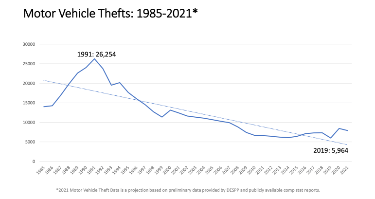 Barone reiterated that there were significantly fewer car thefts in 2021 compared to the peak in 1991, when there were 26,254 such crimes. In 2019, there were only 5,964.