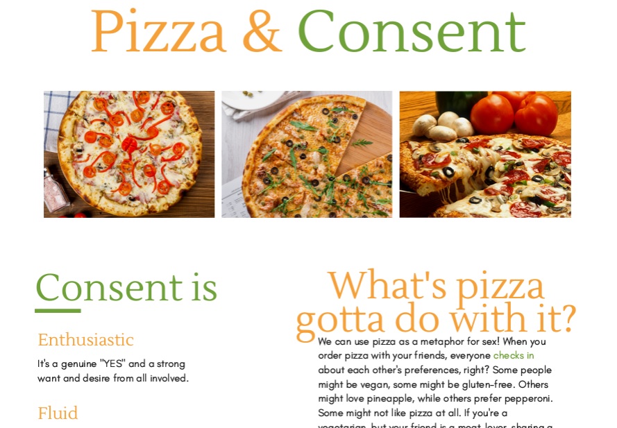 The commercial will dramatize “Pizza & Consent,” a lesson that used different tastes in pizza toppings as a metaphor in a discussion about getting and recognizing genuine consent before engaging in any form of sexual intimacy.