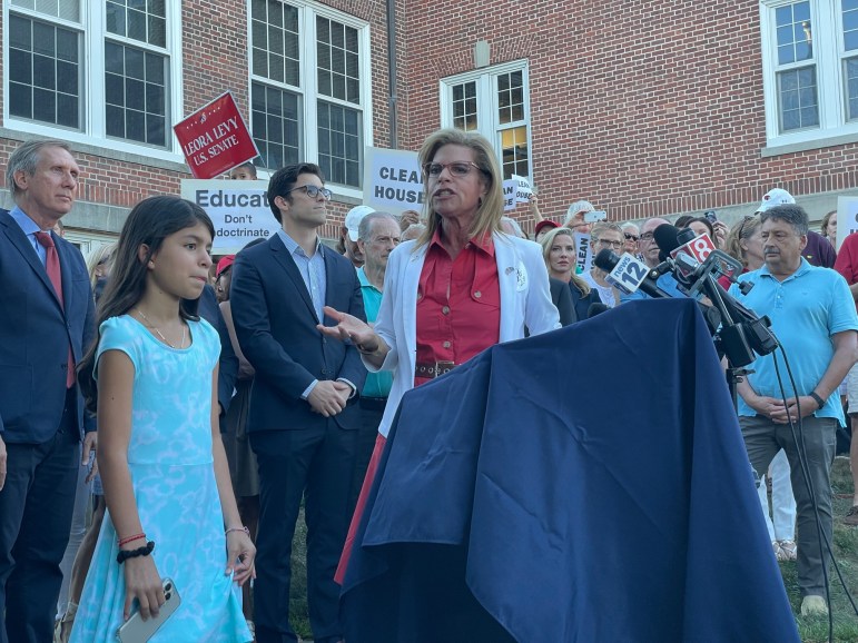 GREENWICH — James O’Keefe grinned as he strode to the microphones outside the Cos Cob School on Wednesday night, ready to taunt the mainstream media and accept the fulsome praise of Leora Levy, the Republican nominee for U.S. Senate.
