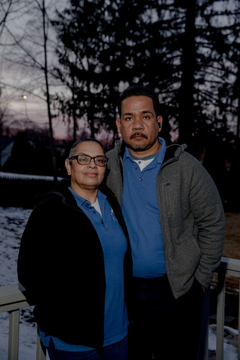 Myriam Nevarez, left, and José Rodriguez worked as housekeepers at UConn during the pandemic. Rodriguez cleaned in-patient covid wards while Nevarez disinfected the entrance out of many other tasks. But when their whole family had to quarantine at home for three weeks after Rodriguez tested positive a second time, the couple didn’t get any payment. Credit: Yehyun Kim / ctmirror.org